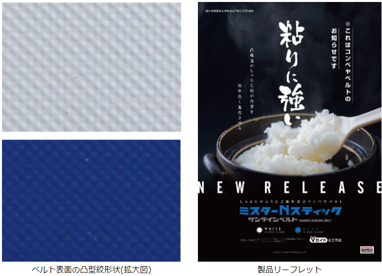 バンドー化学株式会社(本社:兵庫県神戸市)は、このたび軽搬送用ベルト「サンライン®ベルト ミスターシリーズ」の新たなラインアップとして、食品用非付着性ベルト「ミスターNスティック™」の販売を開始しましたので、お知らせいたします。