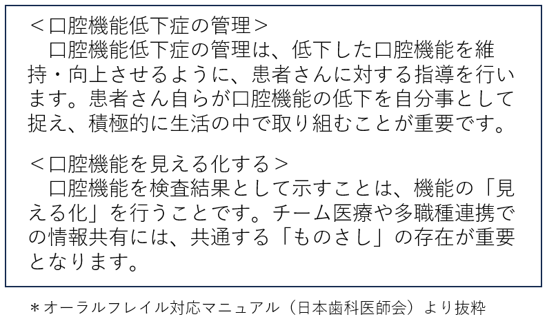 上記の3項目以上に該当する場合は口腔機能低下症と診断され、口腔機能低下症と診断された場合は、地域の歯科医院での対応が求められており、検査結果に基づき個々の口腔状況に応じて口腔機能管理や口腔リハビリテーションを行う必要があります。