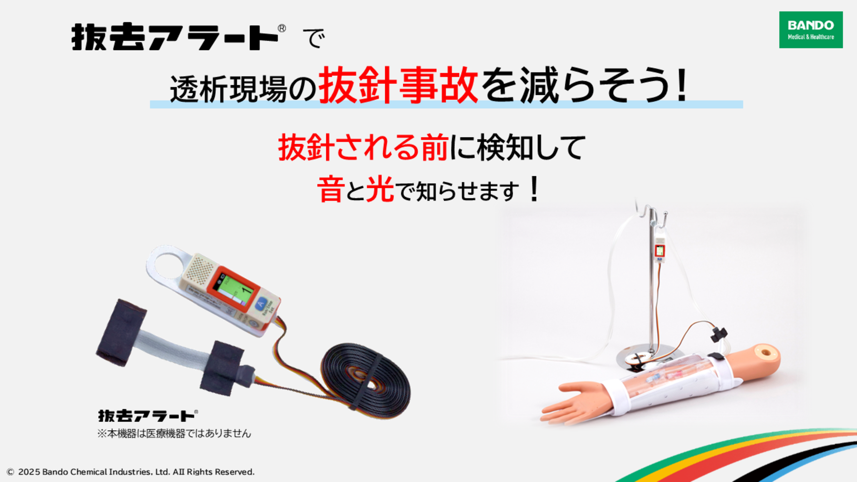製品ページに戻る > 関連資料 関連資料のダウンロードはこちら コンセプト説明動画 抜去アラートとは? 検出原理 不穏行動の検知 利用シーン 製品仕様 画面表示 仕様 購入・デモ機・説明会について、お気軽にお問い合わせください。 おすすめの製品情報 抜去動作検知システム「抜去アラート®」 人工透析中の抜去動作を検知し、音や光で知らせるヘルスケア機器 詳しくはこちら 伸縮性ひずみセンサ「C-STRETCH®」 センサ自体がストレッチャブルで伸びの大きさを検知する全く新しいタイプのセンサ 詳しくはこちら C-STRETCH MEASURE とても柔軟で、本来の動きを妨げません。身体運動や生体情報のリアルタイム計測に適しています。 詳しくはこちら 嚥下運動モニタB4S™ 嚥下時の喉頭の動きを可視化できるヘルスケア機器 詳しくはこちら